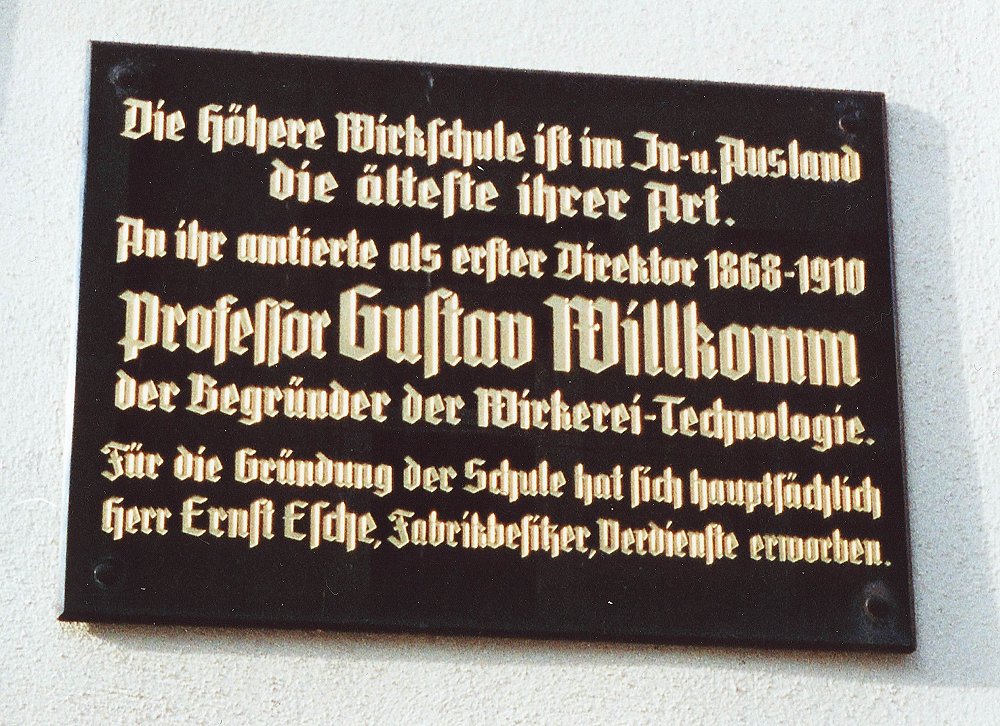 Gustav Willkomm war der Gründungsdirektor der Wirkschule und hat die Entwicklung der Wirkerei-Industrie durch die von Ihm erarbeiteten Lehrunterlagen und durch die Unterweisung von Studenten aus vielen Ländern der Welt wesentlich geprägt.