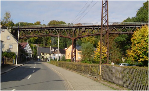 | Erfolg hatten die Limbacher mit der Anbindung nach Wüstenbrand. Die Strecke verlief von der westlichen Seite des Bahnhofs Limbach über Kändler, Röhrsdorf, Rabenstein, Grüna nach Wüstenbrand. In Rabenstein musste das Tal mit der Burg durch eine große - 23 m hohe und 150 m lange - Stahlbrücke, die auch heute noch existiert, überquert werden. Eine meisterhafte und ästhetisch schöne Ingenieurleistung. Damit war man direkt an die Kohlenbahn, die von Wüstenbrand nach Lugau - Ölsnitz führte, angebunden - ein wichtiger Anschluss in Anbetracht der Kohle fressenden Dampfmaschinen in der heimischen Textilindustrie. Die Strecke wurde am 01.12.1897 eröffnet und am 30.11. mit vielen Gästen eingeweiht. Allerdings muss es Schwierigkeiten mit dem Fotografen gegeben haben. Er hatte vor lauter Aufregung seine Apparate in Wüstenbrand stehen lassen. Schade, dadurch fehlen heute Bilder von der Einweihung. |