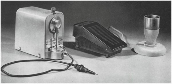 | Arbeitsweise der Strumpfrepassiermaschine: Ein über Pedal drehzahlgeregelter Elektromotor betätigt eine Luftpumpe, die über Luftstöße die Repassiernadel (anfangs Zungennadeln, später Schiebernadeln) in ihrer Führung hin- und her bewegt. Die Laufmasche eines über den Repassierbecher gezogenen Strumpfes kann so repariert werden. | |||||||||||||||||||||