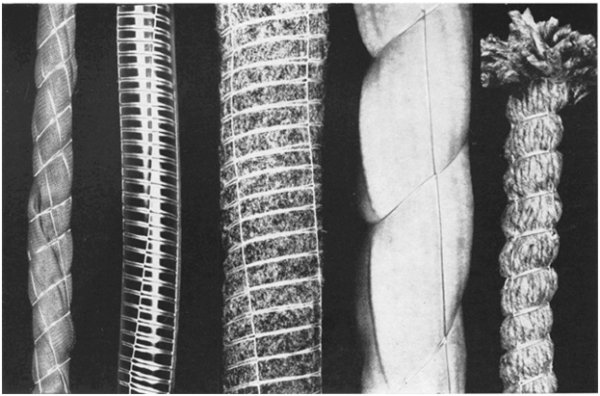 | Mit Hilfe dieser Kemafil-Maschinen wird vornehmlich streifenförmiges textiles Abfallmaterial durch Ummantelung mittels Fäden zu Seilmaterial verarbeitet, das zum Beispiel als Schnur in der Landtechnik oder als Dichtmaterial in der Bauindustrie Verwendung findet. | |||||||||||||||||||||