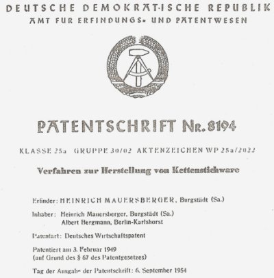 | 1949 | Das Patent mit dem Titel „Verfahren zur Herstellung von Kettelwebstoff“ hatte Mauersberger am 31.01.1949 fertig formuliert und am 02.02.1949 im DDR-Patentamt hinterlegt. Mit dem Datum 03.02.1949 wurde das Patent WP8194 unter dem neuen Titel „Verfahren zur Herstellung von Kettenstichware“ vom Amt für Erfindungs- und Patentwesen der DDR in der Gruppe der „Vielnadelnähmaschinen“ erteilt. Erst später erfolgte national und international die Eingliederung des Patentes in die Gruppe der „Kettenwirkmaschinen“. Nach mehreren vorläufigen Begriffen wie „Kettelweben“, „Kettenstechen“ oder „Malimieren“ prägte Mauersberger mit Fachkollegen und Patentingenieuren etwa 1953 das neue Wort „Nähwirken“, dass sich schnell weltweit durchsetzte. | |