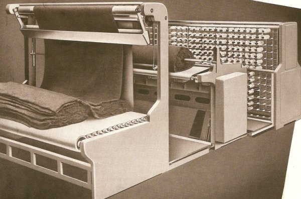 | Wirtschaftlichkeitsbetrachtung: Bei 500 Stichen pro min und 2 mm Stichlänge könnte seine hochproduktive Technologie eine Stoffproduktion von 1 m/min bzw. 60 m/h leisten. Demgegenüber lieferte eine Webmaschine damals nur etwa 4 bis 5 m/h Gewebe. | ||