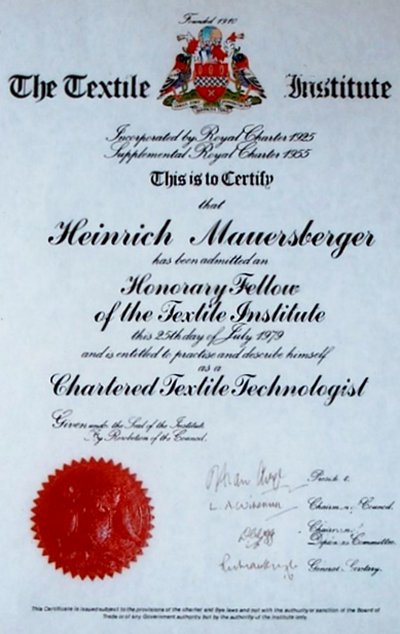 | 1979 | wurde ihm als zweitem Deutschen die Ehrenmitgliedschaft des Textilinstituts von Manchester (England) verliehen, eine sehr hohe und sehr seltene Auszeichnung. | |