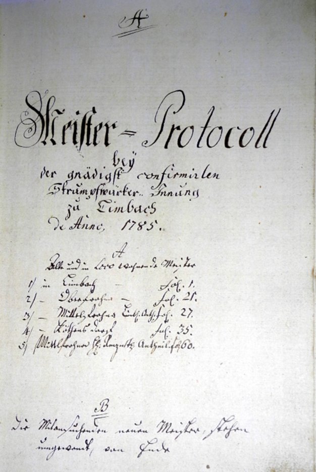 | 1785 | Nach 5 Jahren kann am 25.02. endlich die Konfirmation (Bestätigung) der Innung erfolgen. Diese Limbacher Strumpfwirkerinnung ist eine der ersten Handwerkerinnungen, die einer Dorfgemeinde gestattet werden. Innungsrechte können seit dem Erlass der Generalinnungsartikel 1780 auch Dörfern erteilt werden, zuvor nur Städten. Limbach als bereits starker Wirkereiort erfüllt dafür die Voraussetzungen. | |