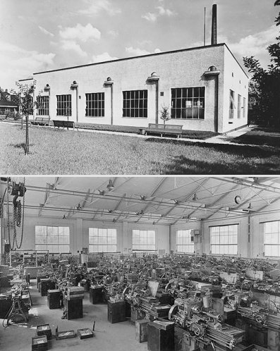 |  Bild 10: Neue Maschinenhalle 1940 von außen (o.) und innen (u.) Bild 10: Neue Maschinenhalle 1940 von außen (o.) und innen (u.)  Bild 11: Kettelmaschine „Uno Conti“ um 1940 Bild 11: Kettelmaschine „Uno Conti“ um 1940  Bild 12: Regulärnähmaschine „Record A.I.35“ um 1940 Bild 12: Regulärnähmaschine „Record A.I.35“ um 1940 |