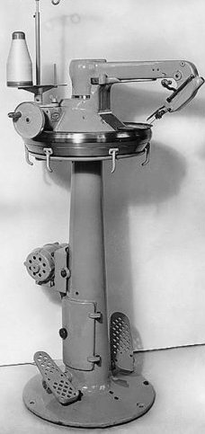 | Außerdem wird eine zweifädige Überwendlich-Rundkettelmaschine, mit der die Spitzen und Fersen der Strümpfe geschlossen werden können, in die Fabrikation aufgenommen. |