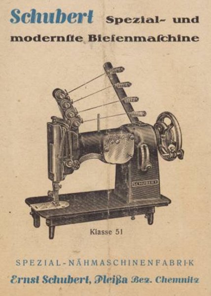 | In diesen Zeitraum, Mitte der 1930er Jahre, fällt auch die Entwicklung der Universal-Zick-Zack-Biesenmaschine, Kl 51 C, der bedeutendsten Schubertschen Nähmaschine. |