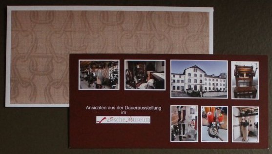 Fünf Ansichten der Dauerausstellung des Esche-Museums in einem mit einem Maschenmotiv bedruckten Umschlag können Besucher im Museumsshop kostenlos erhalten.