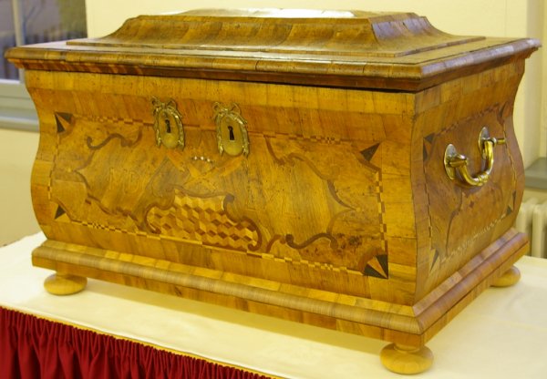| Zur Konfirmation erhält die Innung kostbare Geschenke, beispielsweise ein vergoldetes Handwerksschild von Helena Dorothea von Schönberg zur Kennzeichnung des jeweiligen Versammlungsorts und einen „zienernen Willkommen mit innestehendem Becher“ (ein Humpen für den Ehrentrunk neu eintretender Meister), der mit kostbaren alten Münzen, eingenäht in seidene Bänder, behängt ist. Alles in allem wiegt der „Willkommen“ etwa 10 Pfund. | ||