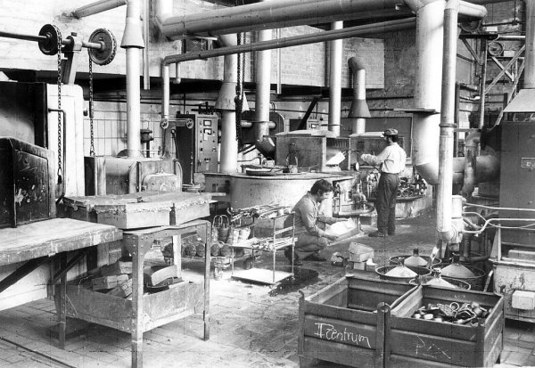 | 1971-1973 | kann durch den Bau einer großen Maschinenhalle schließlich die Beengtheit der mechanischen Abteilungen beseitigt, und gleichzeitig moderne hygienische Sozialräume geschaffen werden. | ||||||