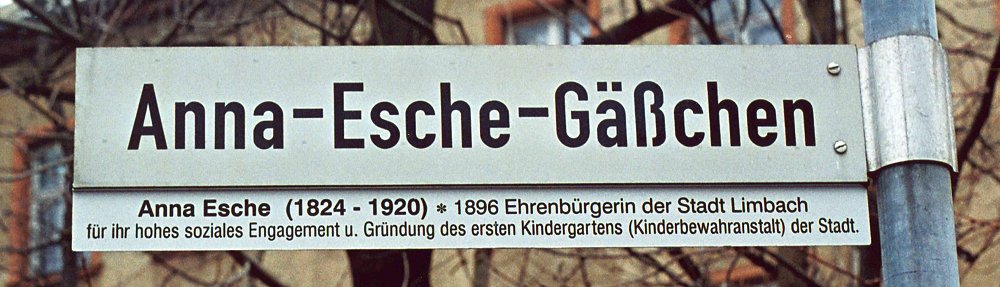 Bei Anna Esche hingegen wich man von dieser Gewohnheit gleich zweimal ab. Sowohl das Anna-Esche-Gäßchen als auch die Anna-Esche-Straße sind mit Vor- und Zunamen benannt.